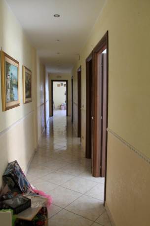 La distribuzione interna vede la presenza di un ampio soggiorno, una cucina, tre camere, un piccolo ripostiglio, due servizi igienici, per una estensione totale di circa 130 mq. Vi sono inoltre due balconi, posti uno sul lato est di circa mq 8.60 e uno sul lato sud di circa mq 11.60; quest’ultimo è stato chiuso con struttura precaria realizzando un piccolo ambiente utilizzato come ripostiglio.