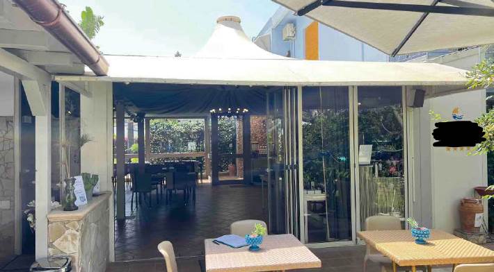 La sala colazione è realizzata con una tensostruttura mobile in acciaio, alla quale si accede dall’esterno.